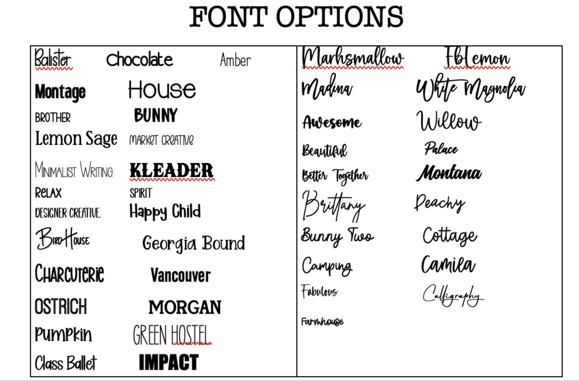 Please refer to the listing pictures for the colors, stains and fonts that we offer.