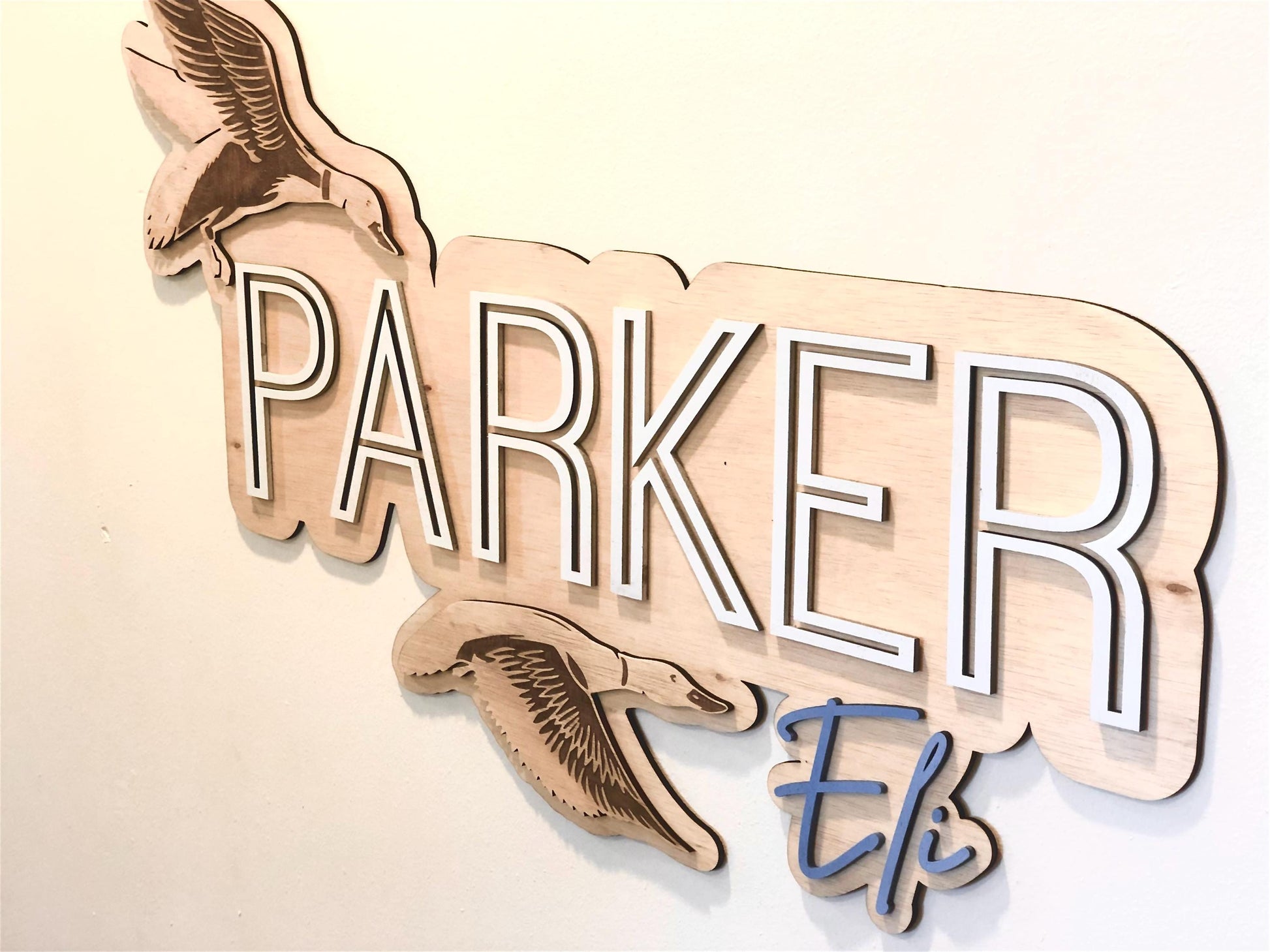 The back layer is made out of 1/4” wood. The top layer feature name and cut and engraved ducks. They are cut out of Premium 1/4 Birch or Maple plywood. They are painted with your choice of colors. We also have a selection of wood stains that you can choose from. They are listed in the listing photos.