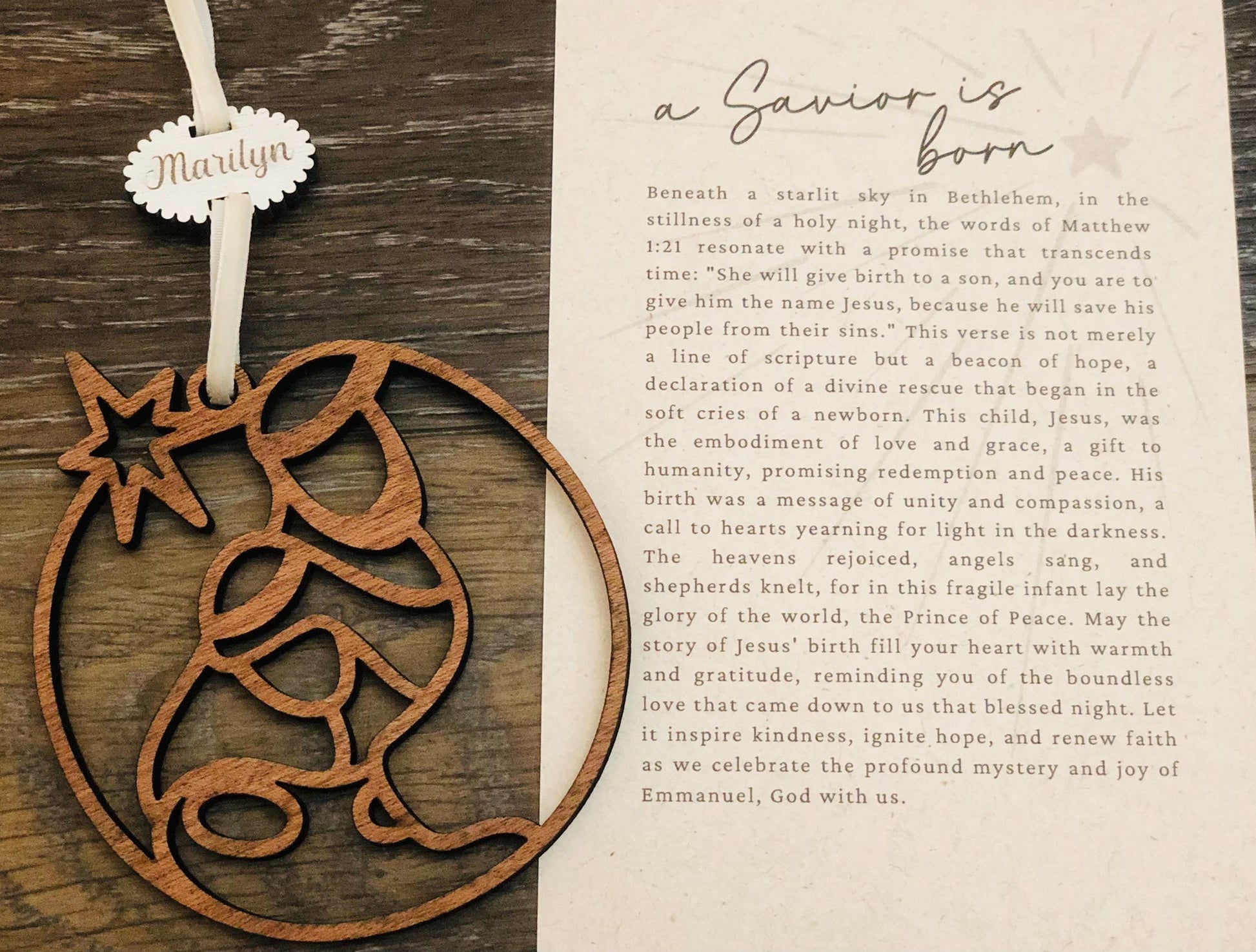 The ornament is laser cut from sepal wood. It measures 3.2" X 3.7" and is a 1 layer without backing or a 2- layer with a northern lights backing. Each ornament comes with an "A Savior is Born" story card. You can personalize this ornament by adding a name on the ribbon charm.
