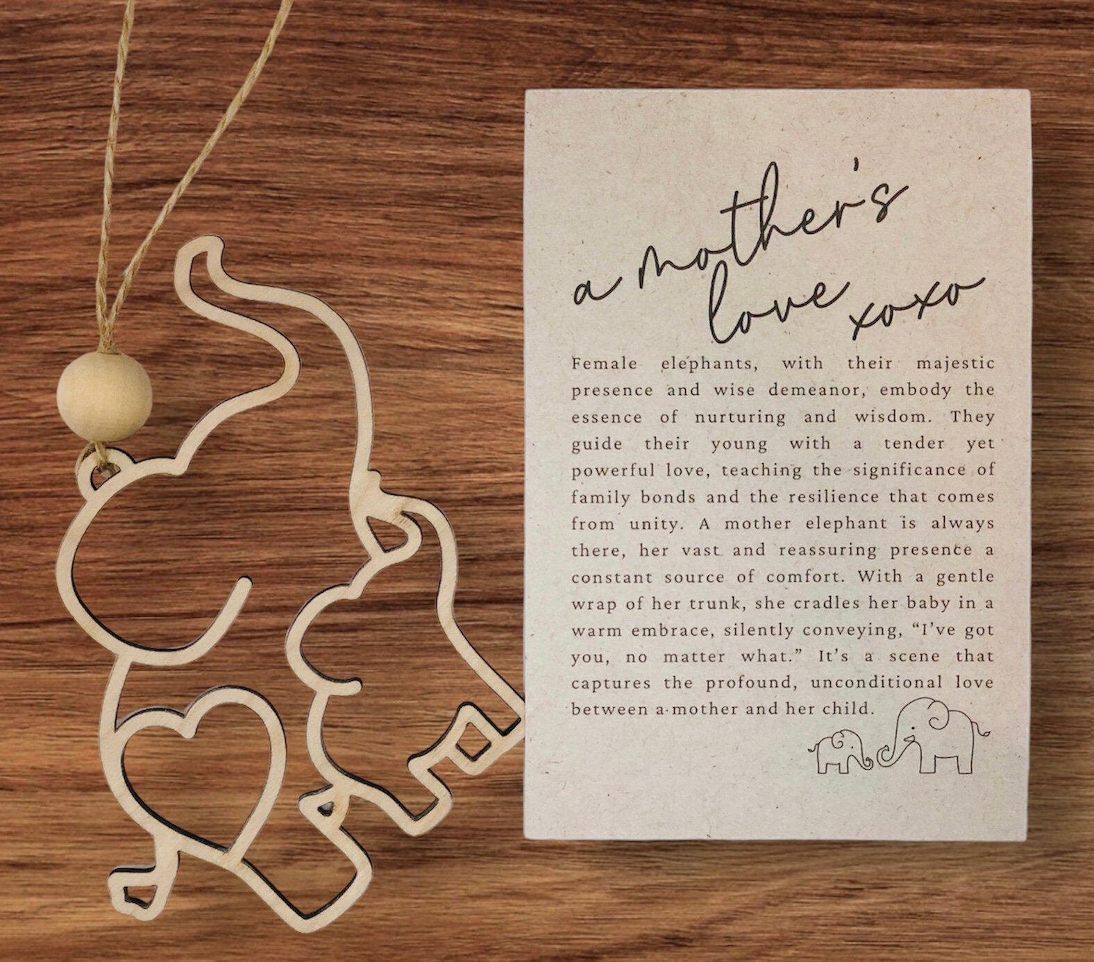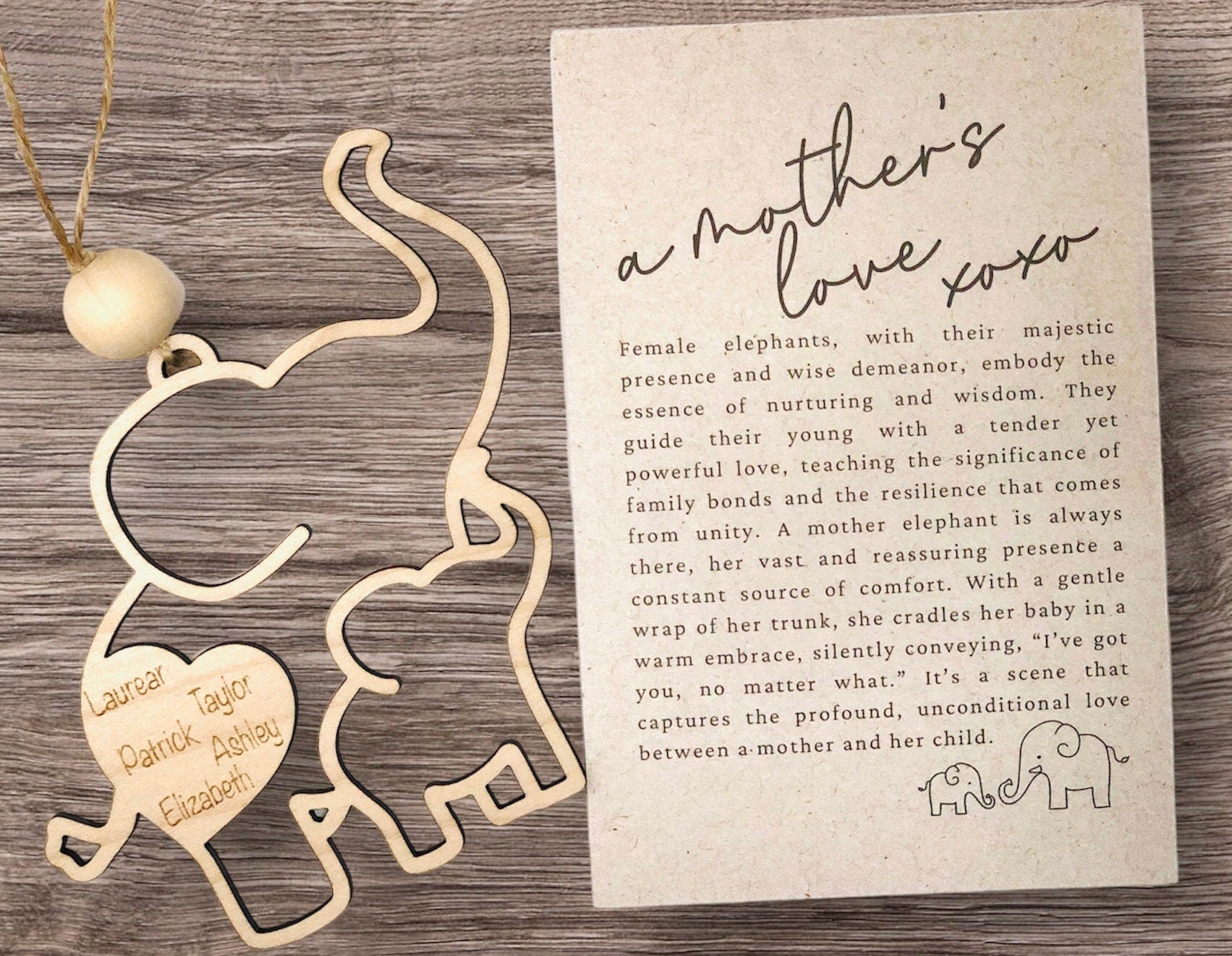 The elephant is laser cut from birch wood. It measures 4.5" X 4.8". There are two options when checking out. A non-personalized ornament or a personalized one. The ornament has a juke string for hanging and is embellished with a wooden bead. This listing contains the elephant ornament and comes packaged with a story card.